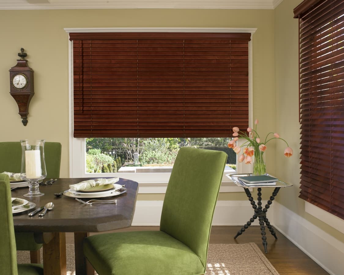 Коричневые деревянные жалюзи универсальны и подходят для большинства интерьеров (от классических до современных), привносят в пространство теплоту и натуральность.